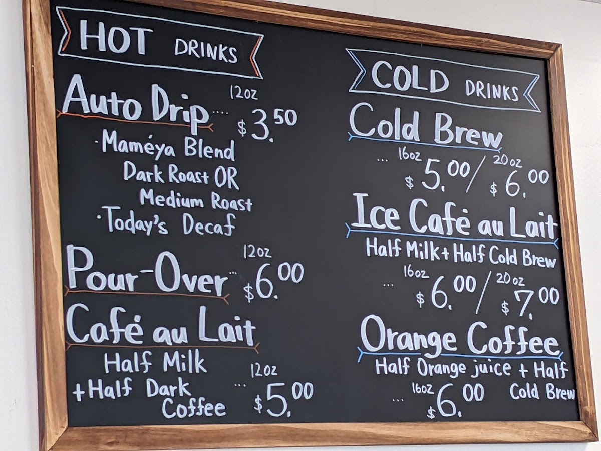 The menu is succinct yet impactful, featuring delights like Cold Brew, Iced Pour Over, and Iced Cafe Au Lait. Notably, the Mameya Blend is a must-try, cherished for its rich flavor and stellar brewing capabilities.